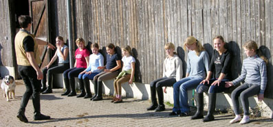 Mittwochs trafen sich die Teilnehmer nach der letzten Reitstunde noch zu einer „Runde“ Theorie im Reiterstüble. Donnerstags wurden Videoaufnahmen gemacht, um den Reitern ihre Stärken und Schwächen bewusst zu machen und damit sie lernen darauf zu reagieren. Vor dem Mittagessen stand an diesem Tag erst noch Gymnastik und Sitzschulung auf dem Programm.