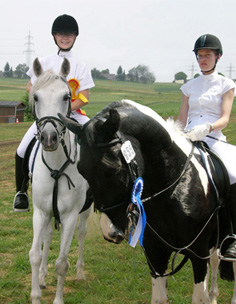 Reitturnier in Kernen-Rommelshausen am 16./17. Juli 2005 Trotz Hitze und weiter Anreise waren zwei Großbottwarer Nachwuchsreiterinnen im Reiterwettbewerb am Start. Julia Georganoudis mit „Gentleman“ und Ines Gnoth mit „Zotti“. Wie die Profis hatte jede Reiterinnen eine eigene Betreuerin und Pferdepfleger dabei. Für Julia war Rebekka Schwindt als Betreuerin mitgekommen. Ines freute sich, dass Anne Lorenz zur Unterstützung da war. Als Pferdepfleger fungierten natürlich die Eltern der Reiterinnen. Bei der Siegerehrung freute Ines Gnoth sich als erstes darüber, dass „Zotti“ endlich gelernt hat stehen zu bleiben und sich die Schleife anstecken zu lassen. Eine blaue Schleife, passend zur Vereinsschabracke, bedeutete den 4. Platz. Julia Georganoudis freute sich, dass sie mit „Gentleman“ die Schleife in rot für den 5. Platz bekam.